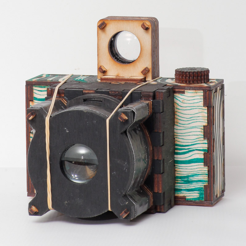 If you have access to a laser cutter, you can cut out and assemble modules to allow you to construct a variety of different types of cameras. By downloading the different modules you can explore all kinds of apertures, viewfinders, light benders, and film systems. The parts that aren’t laser cut are the lens and mirror. They recommend that you experiment a bit with lenses, trying things like using cheap magnifying glasses and harvesting parts from cheap zoom lenses. Here are a few examples from their site. You can see that the style can be varied quite a lot.