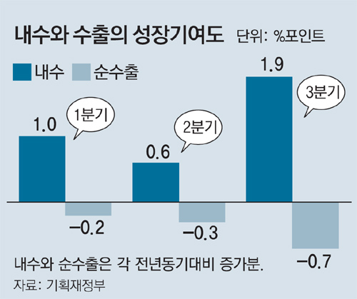 수출 부진이 계속되면서 정부는 3분기(7∼9월)에 이어 4분기(10∼12월)에도 내수 살리기에 다걸기(올인)하고 있다. 하지만 수출이 살아날 기미가 없고 내수만으로 성장률을 끌어올리는 데 한계를 보이자 내년 경제를 걱정하는 목소리가 커지고 있다. 내년 초부터 소비가 급격히 감소하는 ‘소비절벽’이 나타날 수 있다는 우려다.