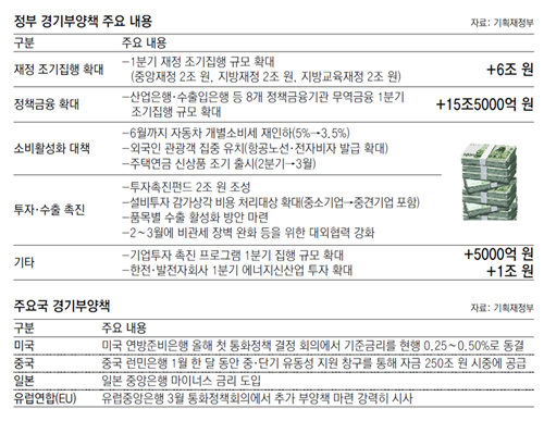 세계 각국이 유동성 공급을 대폭 늘리고 금리를 추가 인하하는 등 경기 부양에 안간힘을 쏟고 있지만 3일 정부가 꺼낸 카드는 재정의 조기집행 확대가 전부였다. 전임 ‘최경환 경제팀’이 2014년 출범 초 41조 원에 이르는 재정 확장 패키지와 내수 부양을 위한 세제 지원 방안, 대출규제 완화를 포함한 부동산 정책, 기업 투자 활성화 대책 등을 쉴 새 없이 쏟아낸 것과 비교해선 무게감이 떨어진다는 평가다. 경제 체질의 근본적인 개선 없이 재정에 의존한 ‘땜질식 처방’이어서 한국 경제가 처한 현재 위기를 돌파하기엔 역부족이란 지적이 나온다.